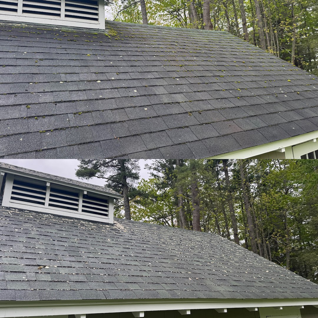 This Tuftonboro, NH garage moss removal was completed as part of an annual exterior maintenance plan, ensuring the roof stays clean, protected, and better equipped to handle long-term exposure to shade and moisture from surrounding pine trees.
