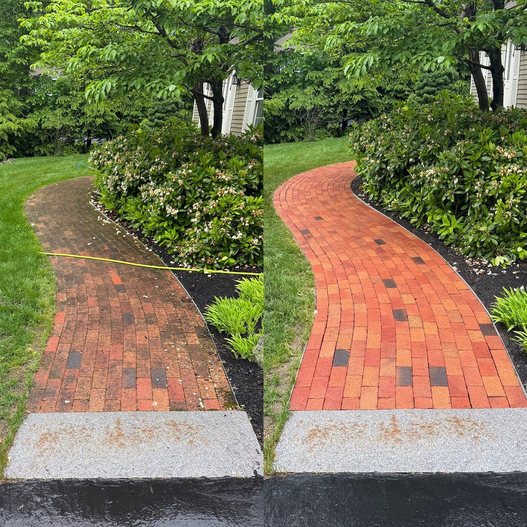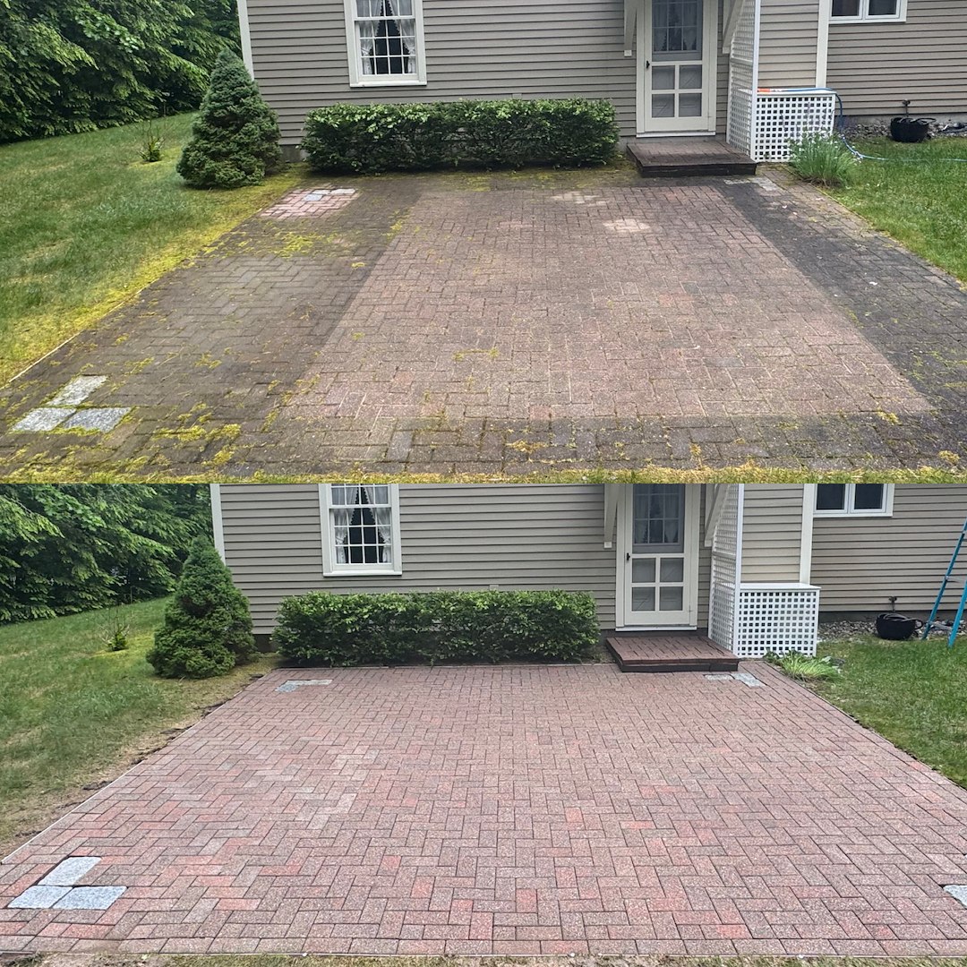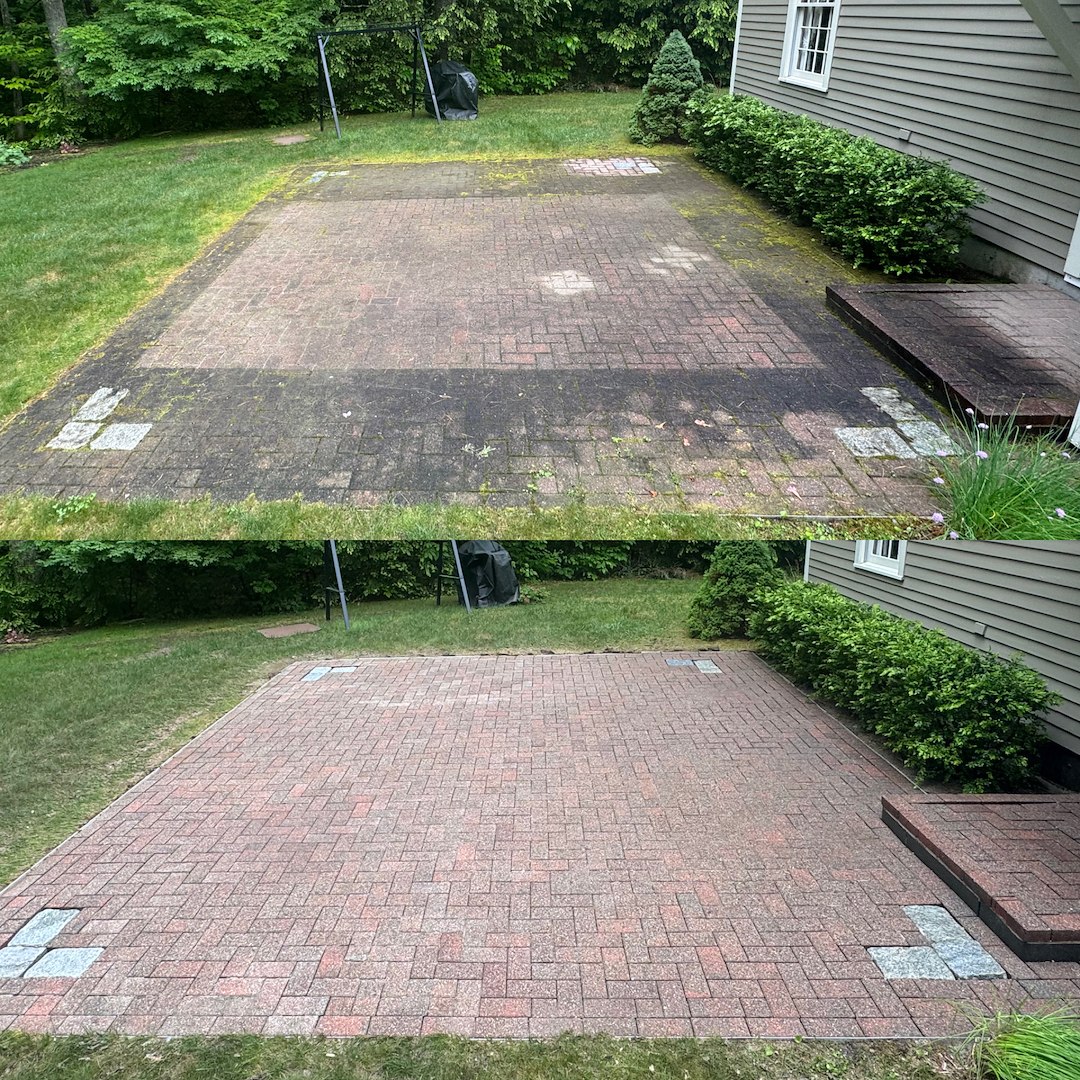 The results brought the pavers back to life, revealing their original color contrast and clean pattern throughout both the curved front walkway and backyard patio space. Beyond the visual transformation, this service plays a key role in preventative maintenance by reducing organic regrowth and helping preserve the longevity of the surface. Projects like this highlight the value of professional paver cleaning, not just for appearance, but for safety, durability, and long-term property care in New Hampshire’s demanding climate.