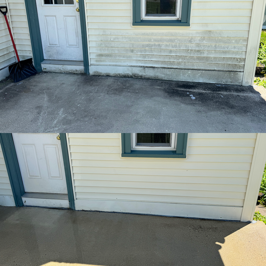 This vinyl siding house wash was completed on a multi-unit apartment building located on North Main Street in Wolfeboro, NH. As a high-visibility property with regular tenant traffic, maintaining clean exterior surfaces is essential for both curb appeal and long-term material care. Over time, the shaded areas of the building had developed heavy organic staining, including algae and grime buildup that dulled the siding and made the exterior appear aged.
